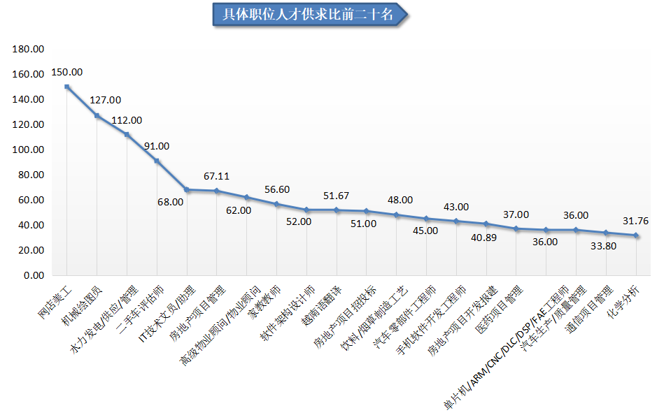 在具体职位中,2020年第二季度,网店美工、机械绘图员和水力发电/供应/管理等职位竞争较为激烈,由于需求极少,这三个职位的人才供求比分别高达150.00 、127.00 以及112.00 ,均超过112人竞争1个岗位,竞争激烈程度遥遥领先。