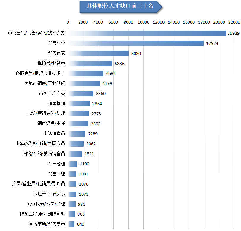 而在用人单位最急需人才的前二十名具体职位中,销售类、市场/营销/策划/推广类等业务类人才最为紧缺,占最急需人才的九成。其中,市场营销/销售/客服/技术支持、销售业务及销售代表等职位分列前三名,这三个职位人才供给量较为缺乏,人才缺口(即需求人才数与求职人才数的差额,下同)分别达到20939人、17924人及8020人。