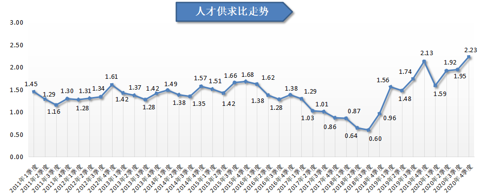 2020第四季度,广西人才网人才供求比为2.23(即人才需求人数或职位数为1时,人才供给或求职人才数为2.23,下同),比上年同期的2.13增加0.10,就业压力稍有增大。