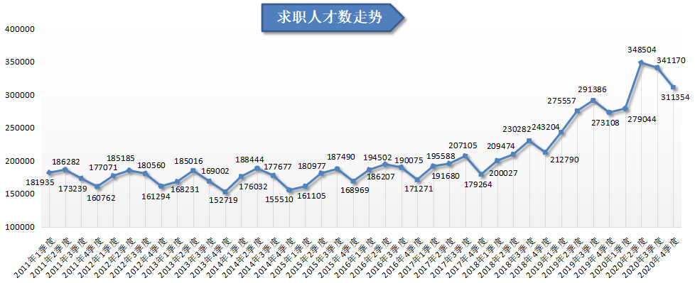 在人才供给方面,求职人才数同比大幅增长,在2020第四季度达到311354人,比上年同期增加38246人,同比增长14.00%,比人才需求的增幅高出5.27个百分点。
