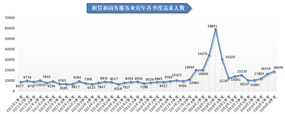 1.租赁和商务服务业人才需求同比增量排名第一,其需求人才数为18606人,与上年同期相比增加了8369人,同比涨幅达到81.75%,环比涨幅为13.87%。其中,职业中介服务行业和企业管理服务行业人才需求增长较大,这两个行业的需求人才数分别为7930人和3969人,比上年同期分别增加5963人和1163人,同比涨幅分别为303.15%41.45%。