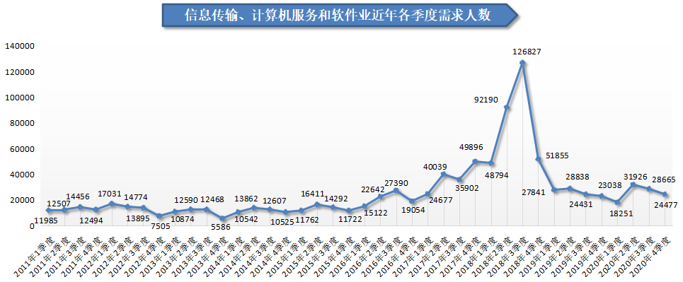 2.信息传输/计算机服务和软件业需求人才数位居榜首,达到24477,与上年同期的23038人相比,增加了1439人,同比增长6.25%。其中,计算机软件行业、互联网行业人才需求增长较大,这两个行业的需求人才数分别为42476966人,比上年同期分别增加2818人和2646人,同比涨幅分别达到197.20%61.25%。