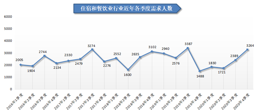 3.住宿和餐饮业人才需求大幅回升,其需求人才数为3264人,与去年同期的1488人相比增加1776人,同比涨幅达到119.35%,环比涨幅为36.63%。其中餐饮行业的人才需求增长较大,需求人才数为2828人,比上年同期增加1500人,同比涨幅达到112.95%,环比涨幅为36.55%。