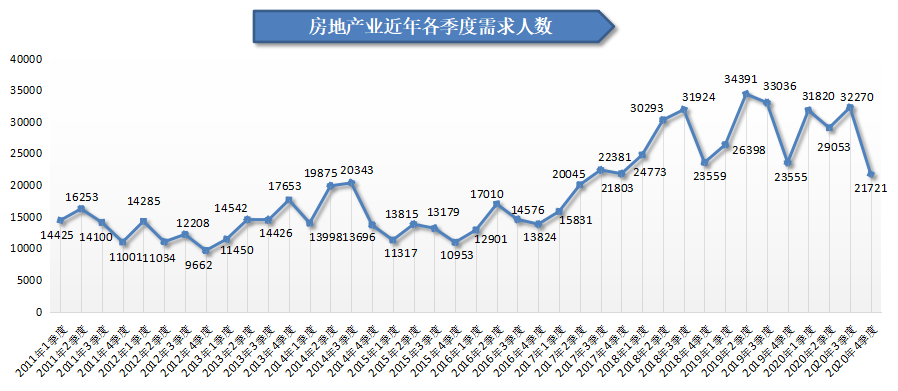 5.房地产业需求人才数为21721人,比上季度大幅下滑32.69%,比上年同期的23555人减少1834人,同比下滑7.79%。