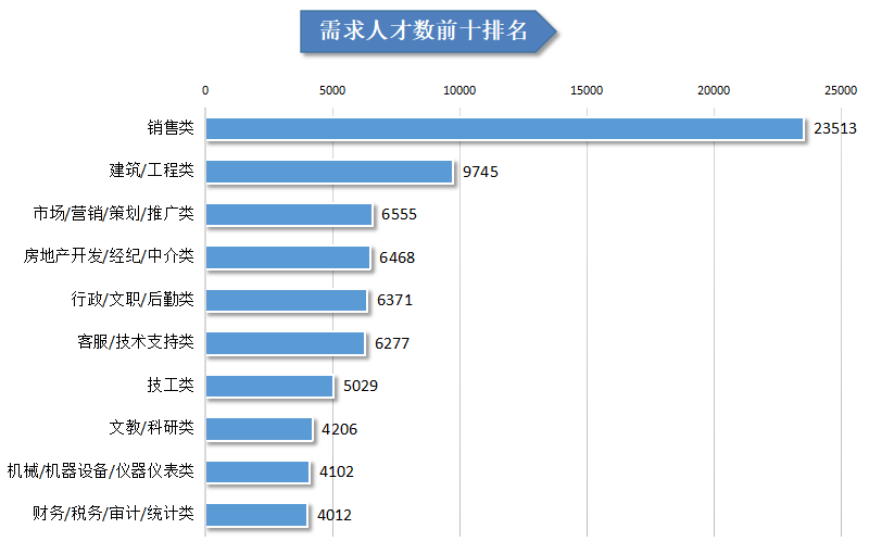位居需求榜前十名的职位:销售类、建筑/工程类、市场/营销/策划/推广类、房地产开发/经纪/中介类、行政/文职/后勤类、客服/技术支持类、技工类、文教/科研类、机械/机器设备/仪器仪表类、财务/税务/审计/统计类等职位类型。这十个职位类型的需求人才数总计76278人,占人才总需求量的54.68%。