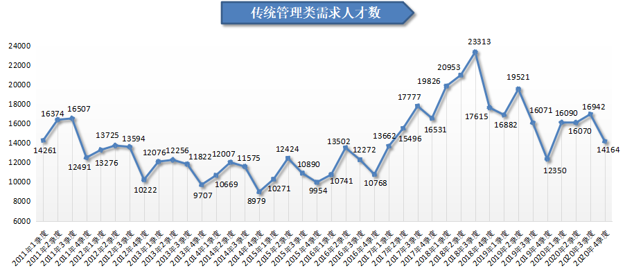 2020年第四季度,广西人才网中传统管理类职位(包含行政/文职/后勤类、人力资源/人事类及财务/税务/审计/统计类等职位类别,下同)的人才需求总量呈季节性回落,14164人,环比下滑16.40%,但与上年同期相比仍增加1814人,同比增长14.69%。其中人力资源/人事类、行政/文职/后勤类以及财务/税务/审计/统计类的人才需求与上年同期相比分别增加了1269人、401人和144人,同比涨幅分别为50.52%、6.72%3.72%。