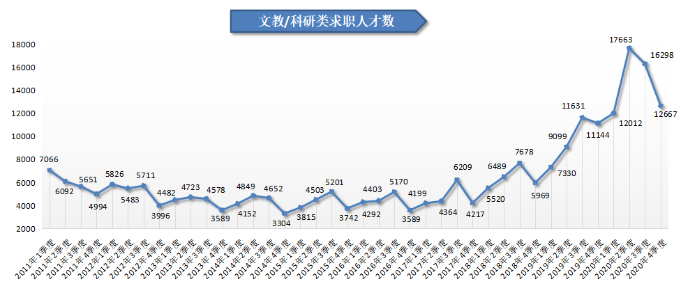 2020第四季度,广西人才网中文教/科研类职位的求职人才数为12667人,比上年同期增加1523人,同比增长13.67%。