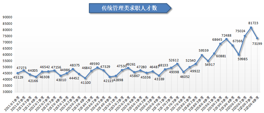 2020年第四季度,广西人才网中传统管理类职位(包含行政/文职/后勤类、人力资源/人事类及财务/税务/审计/统计类等职位类别,下同)的人才供应总量为73199人,虽环比下滑10.43%,但仍比上年同期增加5833人,同比增长8.66%。其中行政/文职/后勤类、财务/税务/审计/统计类及人力资源/人事类职位与上年同期相比分别增加了3937人、1381人及515人,同比涨幅分别为15.06%、4.57%及4.68%。