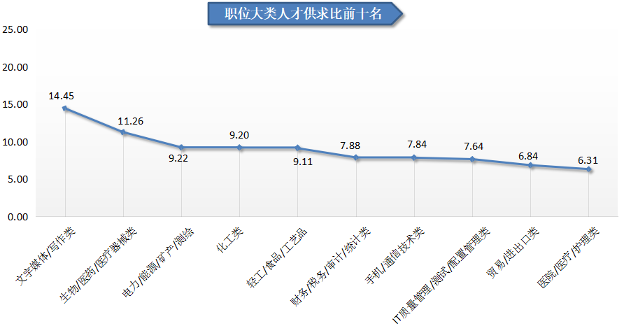 54个主要职位类型中,人才供求比大于2的职位类型有40个,其中31个类型的职位竞争激烈,人才供求比大于等于3。其中文字媒体/写作类、生物/医药/医疗器械类职位由于需求较少,就业竞争压力较大,其供求比分别达到14.45和11.26。