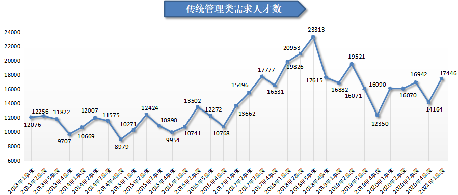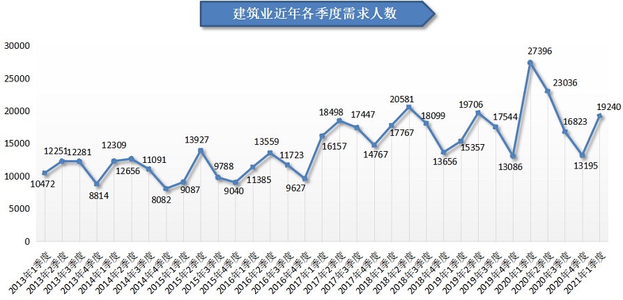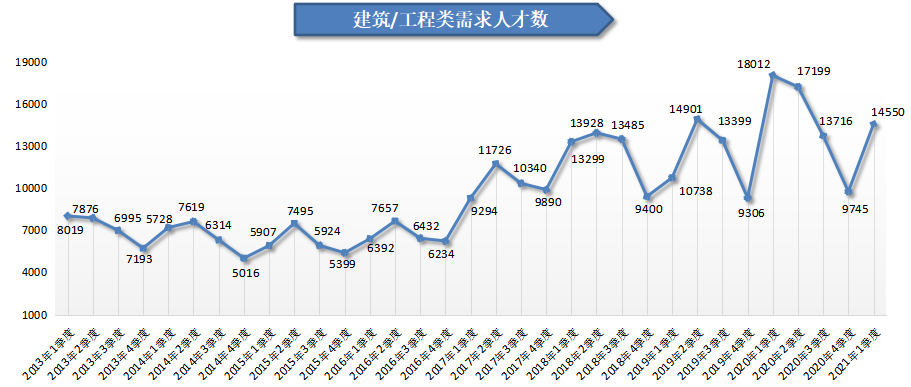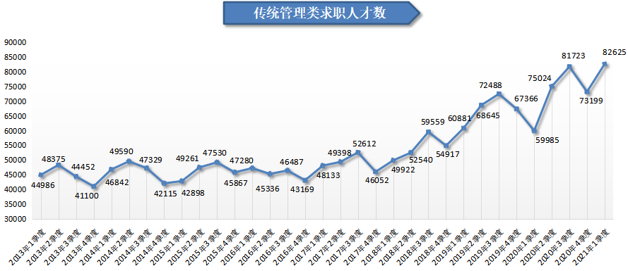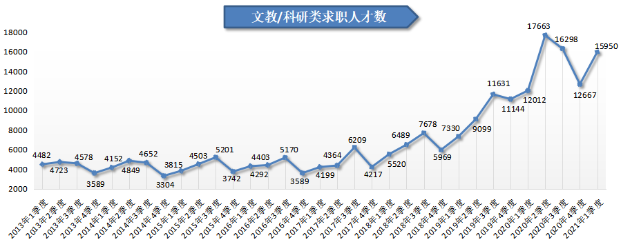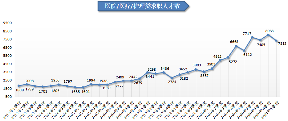 2021年第一季度,广西人才网中求职人才数量接近历史最高水平,从季节性变动趋势上看,求职人才数量呈现较快增长态势,与上年同期相比增长24.03%,与2019年同期相比增长42.30%。
