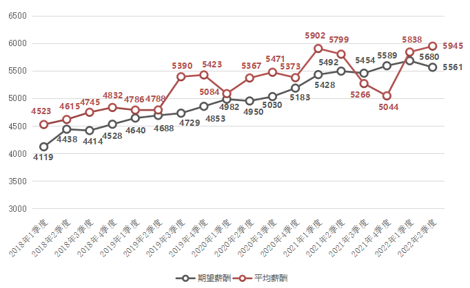 2022年第二季度广西人才网中用人单位发布职位的平均薪酬(其定义见注4,下同)为5945元/月,环比增长1.83%,同比增长2.51%;而求职者期望薪酬(其定义见注4,下同)为5561元/月,环比下滑2.09%,同比增长1.26%。