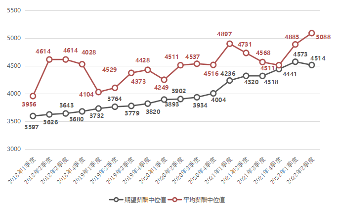 近五年求职者期望薪酬和用人单位发布职位薪酬中位值对比走势图如下: