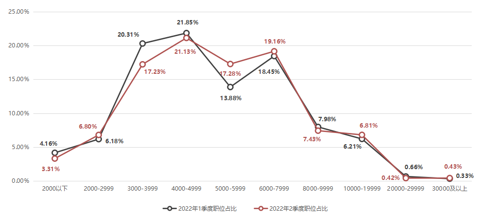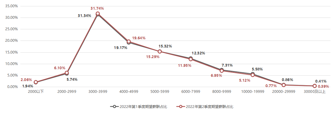 2022年第二季度求职者期望与职位薪酬(各薪酬区间分布)对比曲线图:
