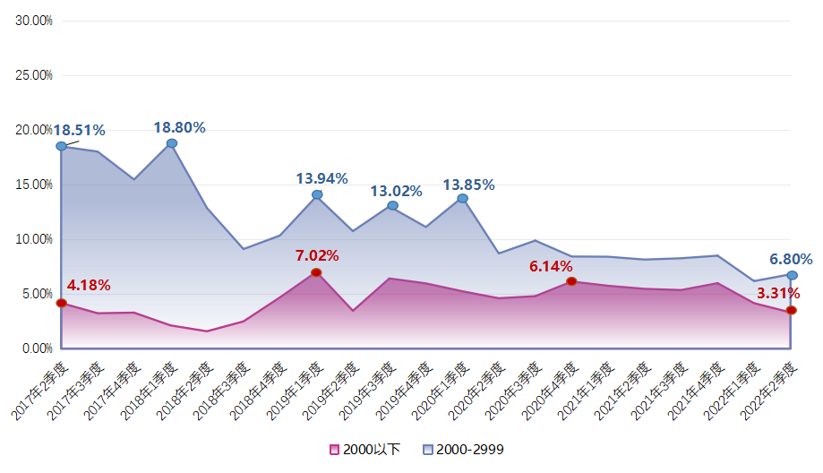 房地产开发/经纪/中介类职位平均薪酬由2022年第一季度的7421元/月降至本季度的6293元/月,环比下降15.19%,比去年同期的8596元/月下降26.79%。
