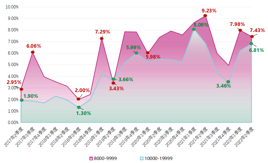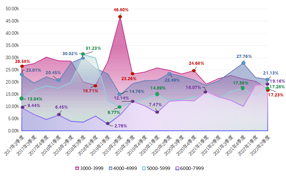 本季度职位薪酬区间占比主要集中在4000-4999元/月区间,占比达到21.13%。与上季度相比,该区间职位占比呈现下滑态势,占比环比下滑0.72个百分点。3000-3999元/月占比为17.23%,占比环比下滑3.08个百分点。而5000-5999元/月和6000-7999元/月两个区间职位占比均呈现不同程度的增长,环比分别增长3.40和0.71个百分点;8000-9999元/月区间占比为7.43%,环比微跌0.55个百分点;10000-19999元/月区间占比为6.81%,环比增长0.60个百分点;20000以上元/月区间合计占比为0.85%,环比下跌0.14个百分点。