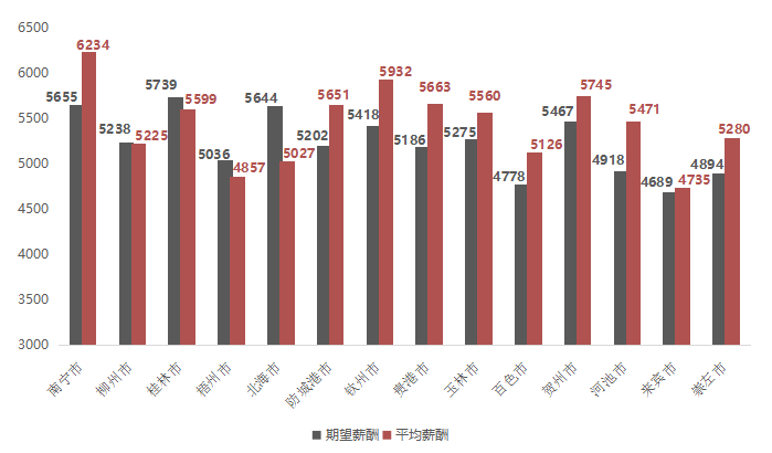 广西人才网中区内主要工作地对应的求职者期望薪酬和职位平均薪酬水平分布图如下(单位:元/月):