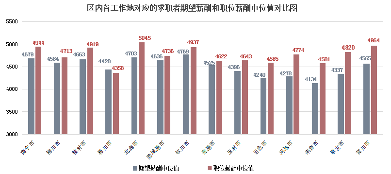 广西人才网中各工作地对应的求职者期望薪酬和职位薪酬中位值如下表(单位:元/月):