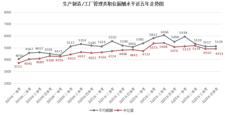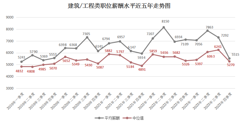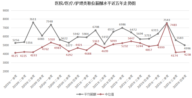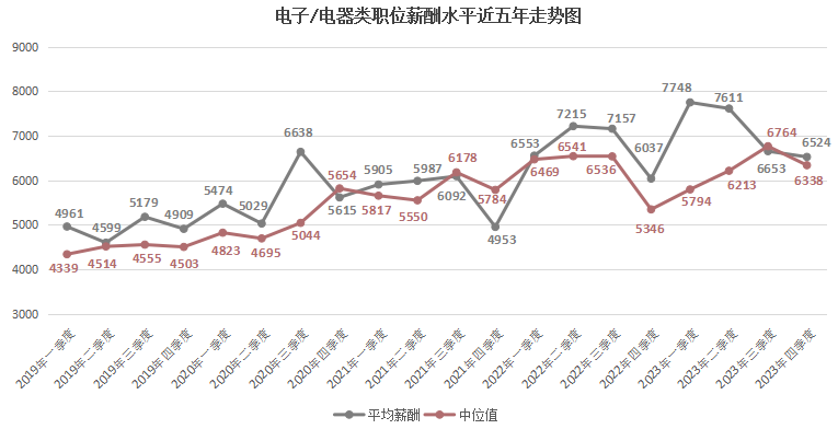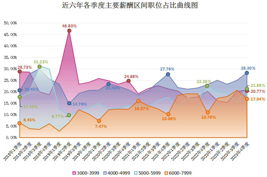由上图可见,近六年2000以下元/月薪酬区间逐年下滑,尤其是在2023年第四季度,该区间的职位数量占比仅为1.40%,这是近六年来的最低值。而2000-2999元/月薪酬区间虽然在某些季度有季节性增长,但整体上也有下滑趋势,在2023年第四季度,该区间的职位数量占比为6.58%。