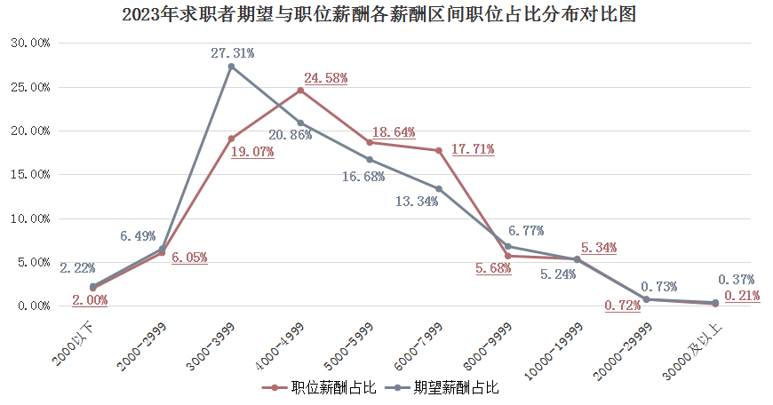 2023年求职者期望与职位薪酬(各薪酬区间分布)对比曲线图: