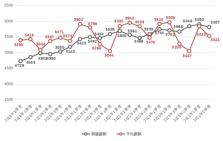 2024年第二季度,广西人才网中用人单位发布职位的平均薪酬水平出现回落,平均薪酬由上一季度的5833/月降至本季度的5521元/月,降幅为5.36%。
