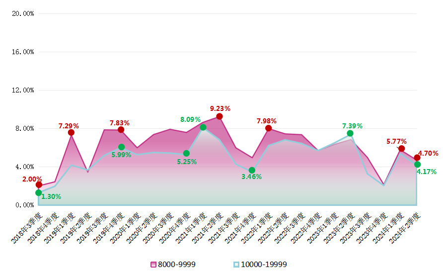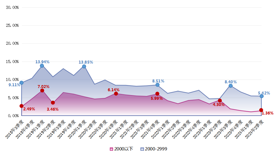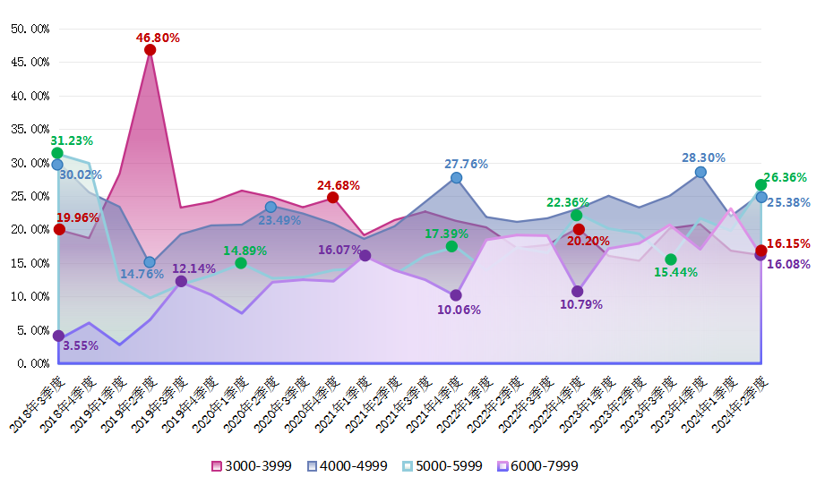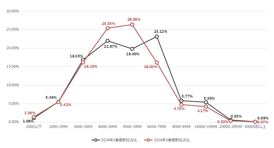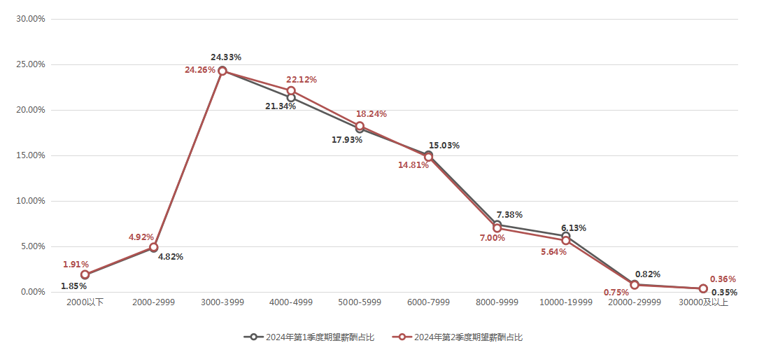 2024年第二季度,求职者期望的薪酬区间占比保持平稳,整体仍呈现出正偏态分布的特征,主要集中在3000-3999元/月区间,该区间的求职者期望薪酬占比达到24.26%。
