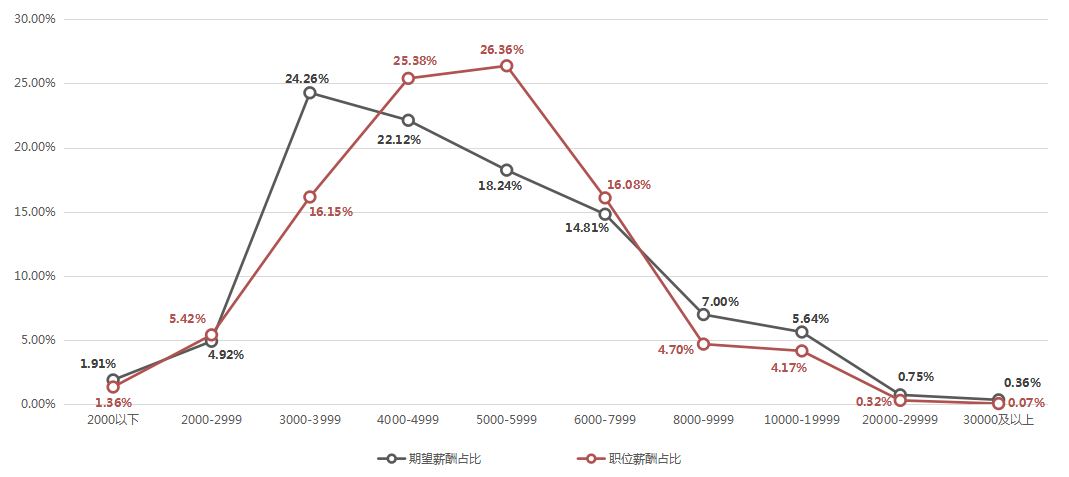 4:职位平均薪酬指的是所属职位类别中用人单位发布职位的薪酬样本加权平均值,不代表单个职位的实际薪酬,例如高级管理类职位平均薪酬为10858/月,但其有很多副总以上级别的高薪职位薪酬更高。期望薪酬指的是求职者期望从事职位类别的薪酬样本加权平均值。