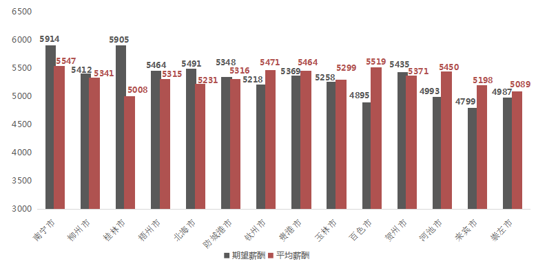 广西人才网中区内主要工作地对应的求职者期望薪酬和职位平均薪酬水平分布图如下(单位:元/月):