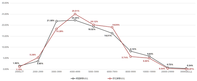 (二)3000-4999元/月薪酬区间职位占比增长明显,高薪区间职位占比呈现不同程度的增长
