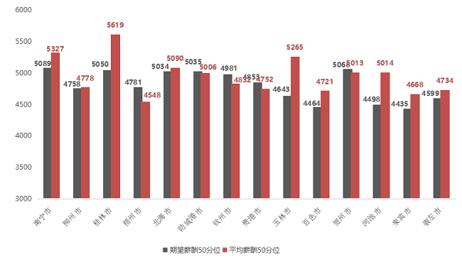 广西人才网中区内主要工作地对应的求职者期望薪酬中位值和职位平均薪酬中位值水平分布图如下(单位:元/月):