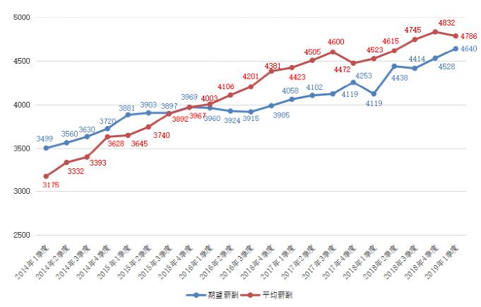 近六年各季度求职者期望薪酬和用人单位发布职位平均薪酬对比走势图如下: