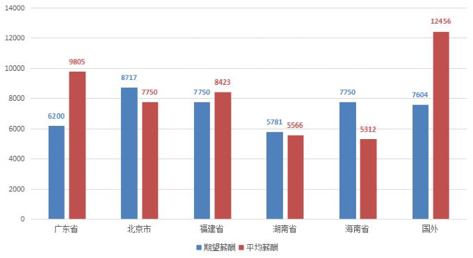 广西人才网联系统中驻区外主要工作地对应的求职者期望薪酬和职位平均薪酬水平分布图如下(单位:元/月):