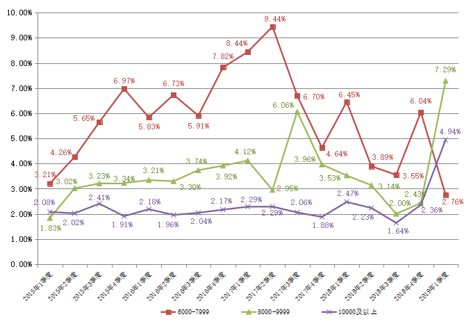 由上图可见,2019年第一季度6000-7999元/月区间的职位数量占比跌至2.76%,环比减少3.28个百分点;而8000-9999元/月和10000及以上元/月较高薪酬区间曲线轨迹波动较大,但均有不同程度的增长。8000-9999元/月区间的职位数量占比为7.29%,环比增长4.86个百分点;10000及以上元/月区间的职位占比为4.94%,环比增长2.58个百分点。