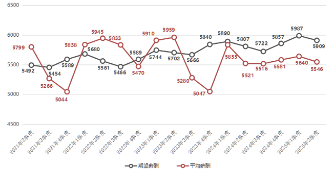 2025年第二季度,广西人才网中用人单位发布职位的平均薪酬水平连续2个季度增长后出现小幅回落,本季度平均薪酬为5546元/月,与上一季度相比,降幅为1.67%。