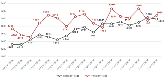 近五年求职者期望薪酬和用人单位发布职位薪酬中位值对比走势图如下: