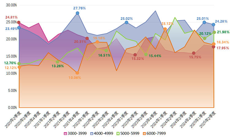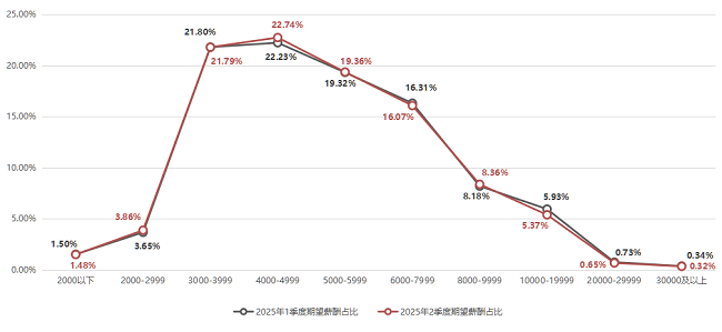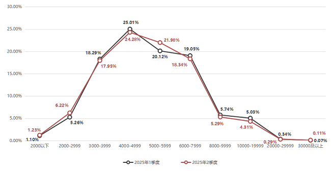 2025年第二季度,求职者期望的薪酬区间占比集中度较高,3000-3999元/月区间、4000-4999元/月区间和5000-5999元/月的求职者期望薪酬合计占比63.35%。