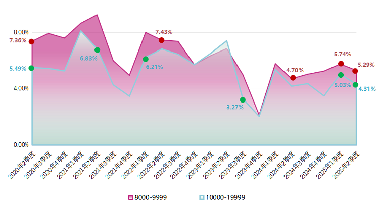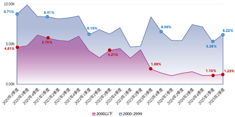 投融资类职位的平均薪酬在今年以来均保持在8000元/月的水平,且本季度与2025年第一季度相比有所增长,本季度平均薪酬为8625元/月,环比增长7.01%。