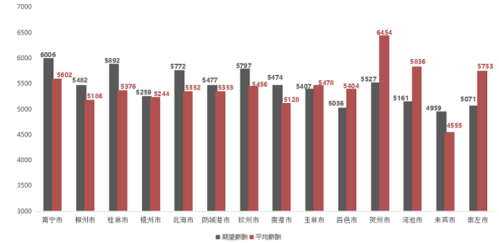 广西人才网中区内主要工作地对应的求职者期望薪酬和职位平均薪酬水平分布图如下(单位:元/月):