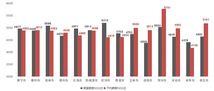广西人才网中区内主要工作地对应的求职者期望薪酬中位值和职位平均薪酬中位值水平分布图如下(单位:元/月):
