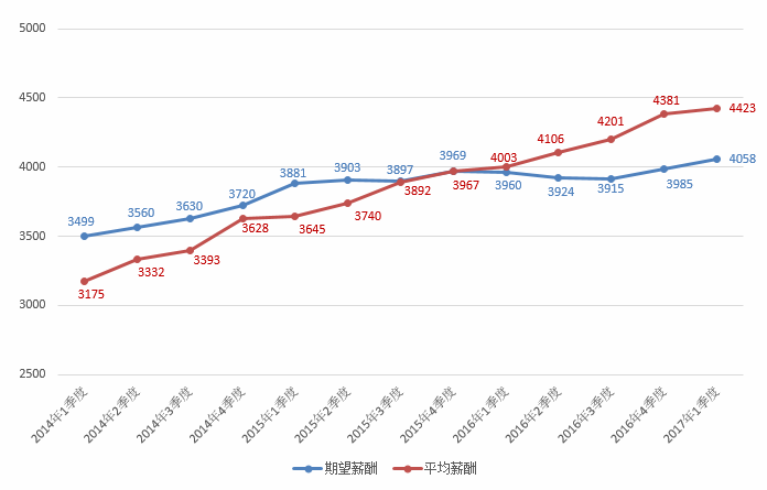 近三年各季度求职者期望平均薪酬和用人单位发布职位的平均薪酬对比走势图如下: