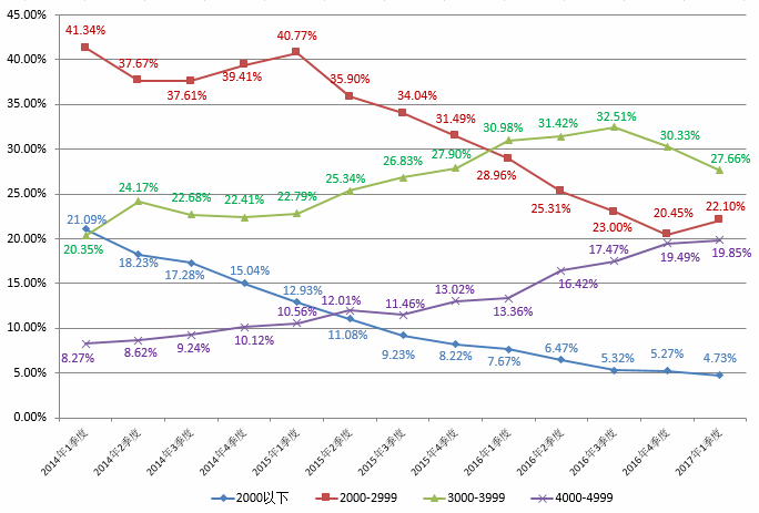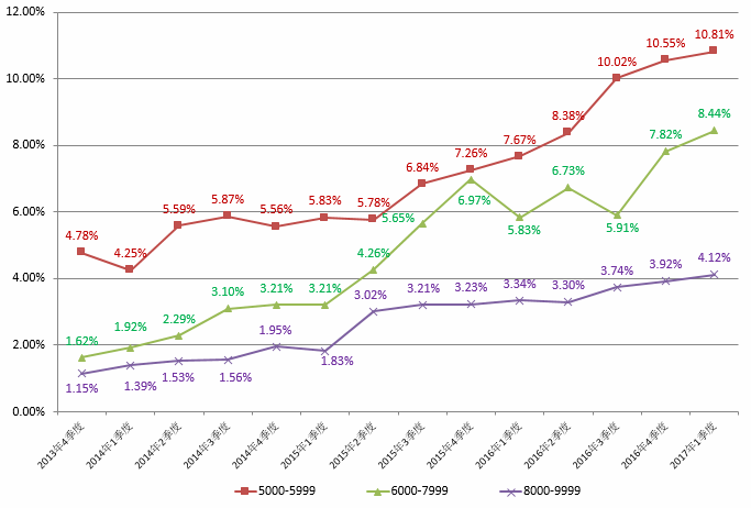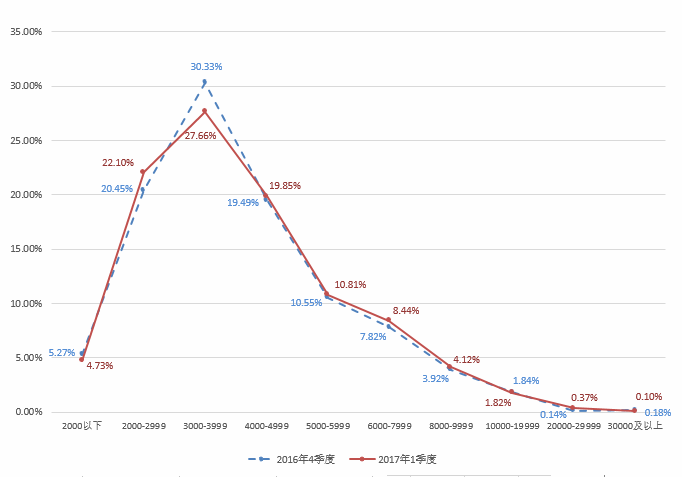 2017年一季度广西人才网联系统中用人单位发布职位的平均薪酬(其定义见注4,下同)为4423元/月,环比微涨0.94%,而求职者期望平均薪酬为4058元/月,环比小幅增长1.83%。用人单位提供的职位平均薪酬水平比求职者的平均期望薪酬略高。