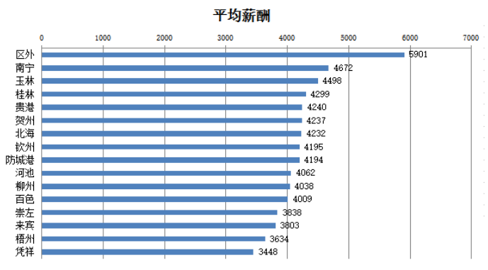 广西人才网联系统中区内意向工作地在各市对应的求职者期望薪酬水平分布图如下(单位:元/月):