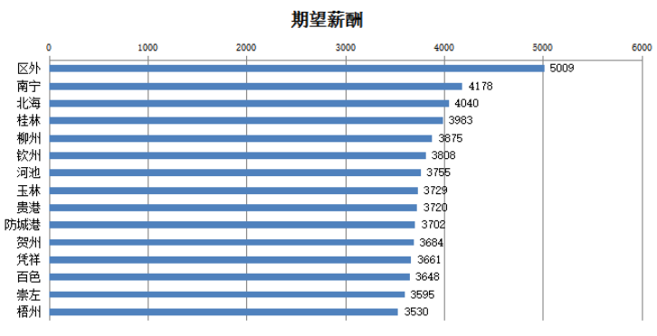 如上图所示,期望在区外工作的求职者对薪酬的要求达到5009元/月,远远高出工作地在区内的期望薪酬。期望在南宁市工作的求职者期望平均薪酬达到4178元/月,期望在北海市工作的求职者对薪酬的要求位居第三,达到4040元/月。