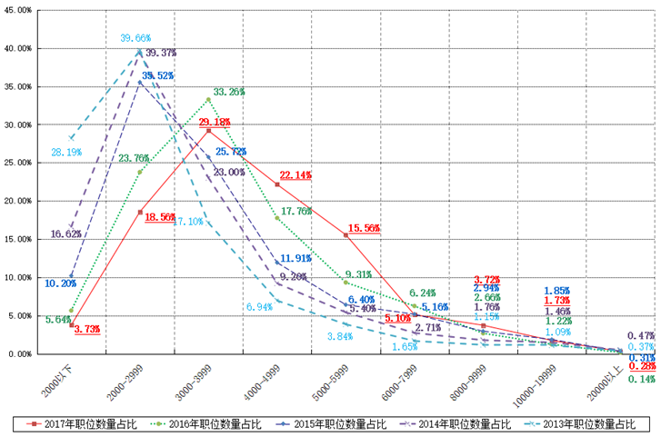 如上图所示,近五年来曲线明显后移,职位平均薪酬水平呈现逐年快速上涨趋势,平均薪酬水平已由2013年的3064元/月增长为本年度的4408元/月,涨幅为43.86%。其中2000元以下/月区间的职位数量占比由2013年的28.19%逐年降至本年度的3.73%,减少24.46个百分点;2000-2999元/月区间的职位数量比例也呈现了非常明显的下降趋势,其职位数量占比为18.56%,比2016年减少5.20个百分点;3000-3999元/月区间职位占比为29.18%,比2016年减少4.08个百分点;而4000-4999元/月区间职位占比为22.14%,比2016年增加4.38个百分点;5000-5999元/月区间职位占比为15.56%,比2016年增加6.25个百分点,高薪职位占比开始走高。