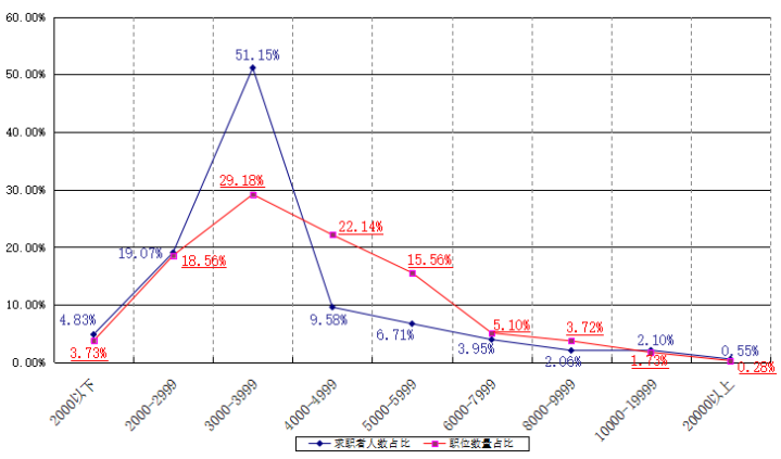 2017年求职者期望与职位薪酬(各薪酬区间分布)对比曲线图: