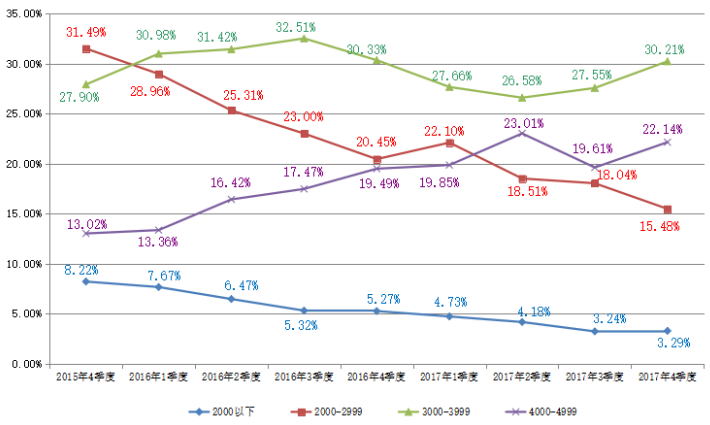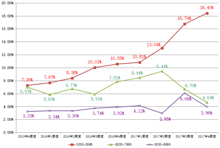 由上图可见,近两年较高薪酬的职位数量占比上升势头明显,其中5000-5999元/月区间的职位数量占比增长幅度尤为明显,2017年第四季度占比已达到18.40%;而6000-7999元/月区间的职位数量占比出现下滑,2017年第四季度下降至4.64%;8000-9999元/月区间的职位数量占比波动较大,2017年第三季度占比达到历年最高值,占比为6.06%,第四季度下滑至3.96%。