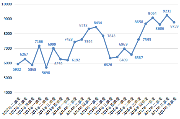 根据广西人才网联系统数据显示,高级管理类职位薪酬水平整体呈现稳步增长的趋势,2017年第三季度达到历年最高值,平均薪酬为9231元/月。2017年第四季度略有下滑,平均薪酬为8759元/月,与三季度相比下滑5.11%。