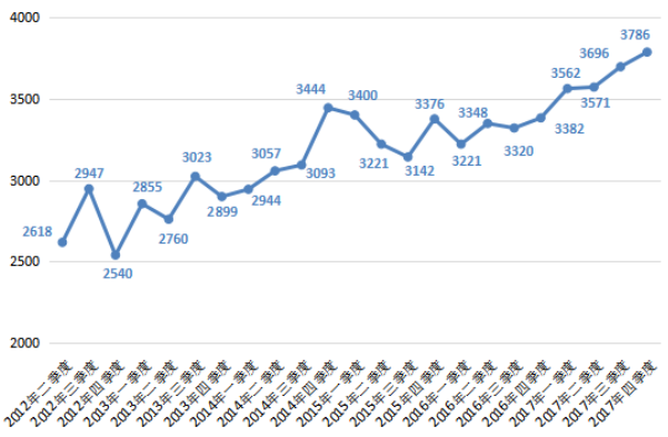 财务/税务/审计/统计类职位平均薪酬整体呈现平稳小幅增长的趋势,2017年第四季度达到历年最高值,平均薪酬为3786元/月,与三季度相比增长2.44%。