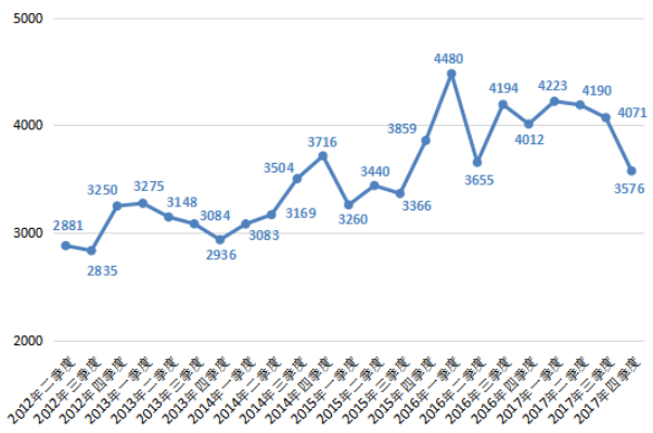 人力资源/人事类职位平均薪酬运行轨迹波动较大,2017年第四季度平均薪酬为3576元/月,下滑较为明显,与三季度相比大幅下滑12.16%。