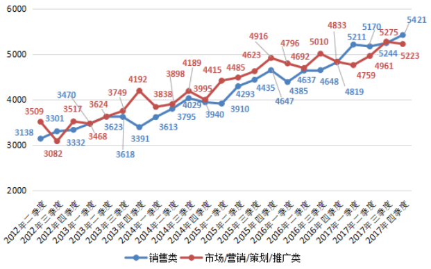 (三)销售类和市场/营销/策划/推广类职位平均薪酬稳步增长