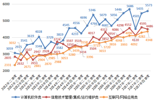 根据广西人才网联系统数据显示,IT类职位平均薪酬仍维持高位,其中2017年第四季度计算机软件类和互联网/网络应用类职位平均薪酬分别为5573元/月和4348元/月,与三季度相比分别增长2.54%和1.54%。而信息技术管理/集成/运行维护类职位平均薪酬4486元/月,与三季度相比小幅下滑2.37%。从目前IT行业发展形势来看,可以说是驰骋于市场竞争中,屡战屡胜。但该类职位对于人才的要求较高,需具备过硬的职业技术和行业经验。也因此该类职位需求量大幅度增长,但存在较大的人才缺口。